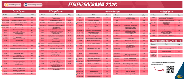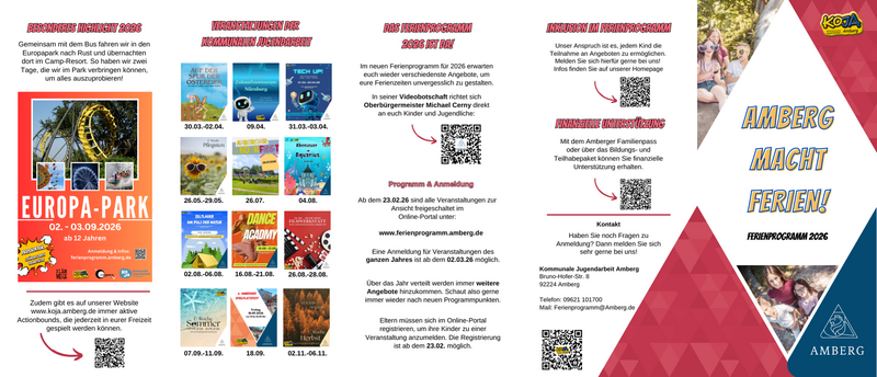 Auch für das Jahr 2026 hat die Kommunale Jugendarbeit Amberg wieder das Amberger Ferienprogramm organisiert und koordiniert. So sind seit dem 23. Februar die Angebote der Oster-, Pfingst-, Sommer- und Herbstferien online und in einem kompakten Programmflyer einsehbar. Amberger Vereine, Verbände und Einrichtungen bieten Kindern und Jugendlichen eine bunte Auswahl an Zeltlagern, Freizeiten, Ausflügen, Schnupperkursen, künstlerischen, musikalischen und sportlichen Aktivitäten. Auch verbilligte Eintrittskarten für Minigolf können über das Ferienprogramm erworben werden. Anmeldungen sind ab 02. März, 9:00 Uhr ausschließlich möglich im Online-Portal.