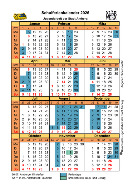 Schulferienkalender 2026 der Kommunalen Jugendarbeit Amberg