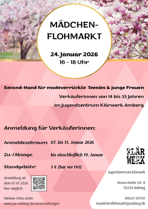 Unser Mädchenflohmarkt findet am 24.01.2026 von 16 - 18 Uhr wieder im Jugendzentrum Klärwerk in Amberg statt!