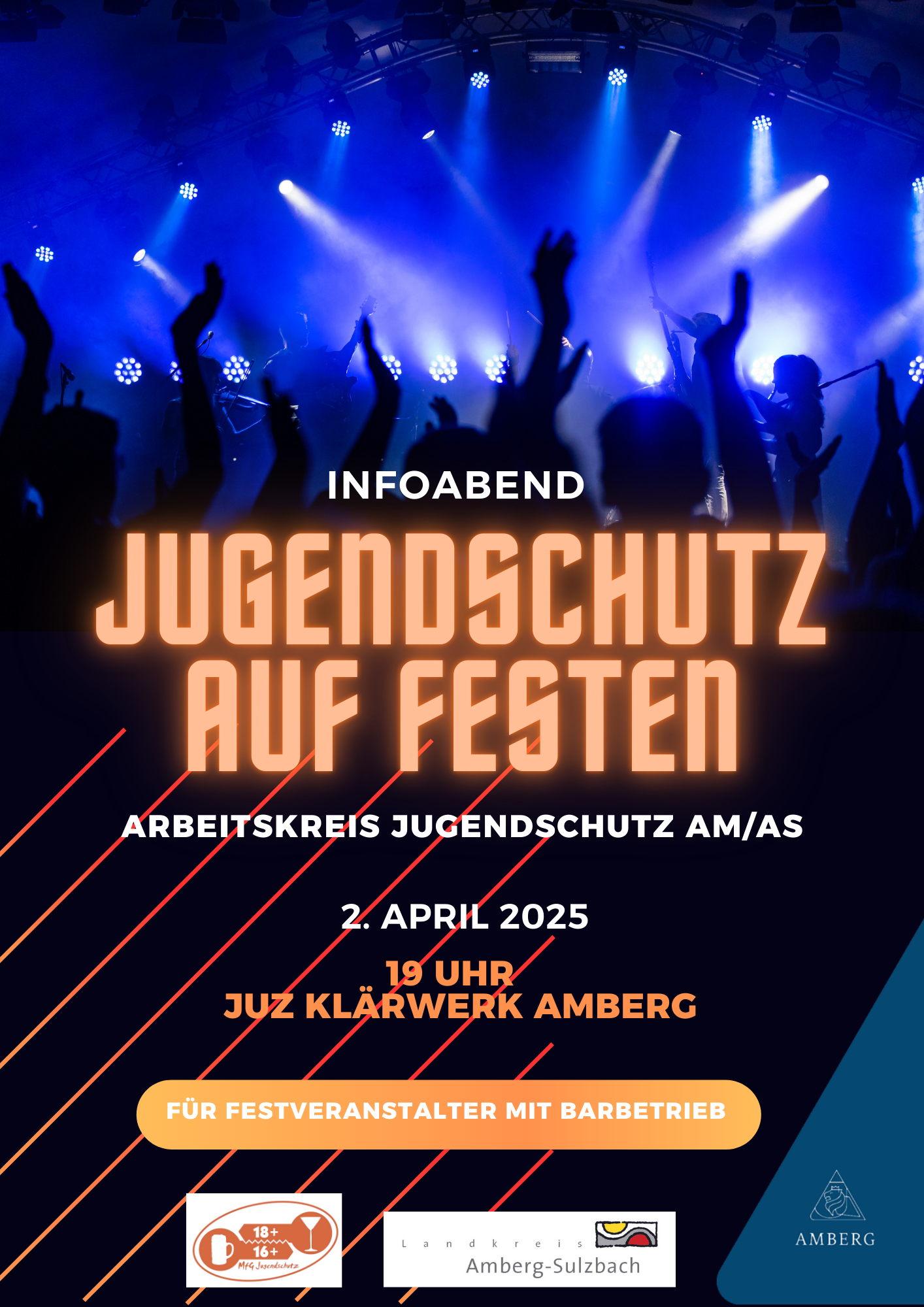 Der Arbeitskreis Jugendschutz Amberg/ Amberg-Sulzbach lädt alle Fest- und Kirwaveranstalter zum Infoabend Jugendschutz am Mittwoch, 2. April 2025 um 19 Uhr in den Saal des Jugendzentrums Klärwerk in Amberg ein.